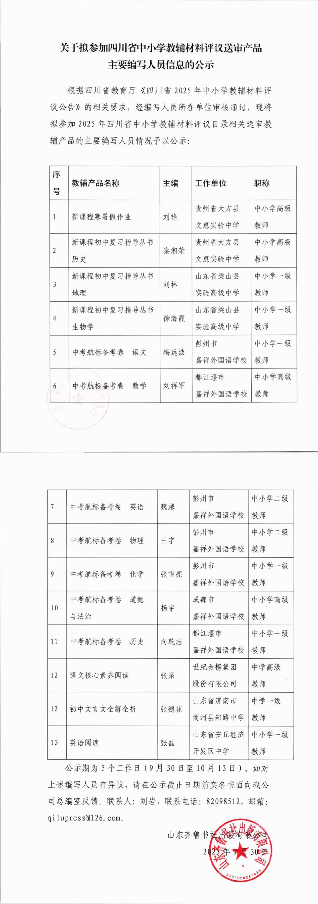 关于拟参加四川省中小学教辅材料评议送审产品主要编写人员信息的公示
