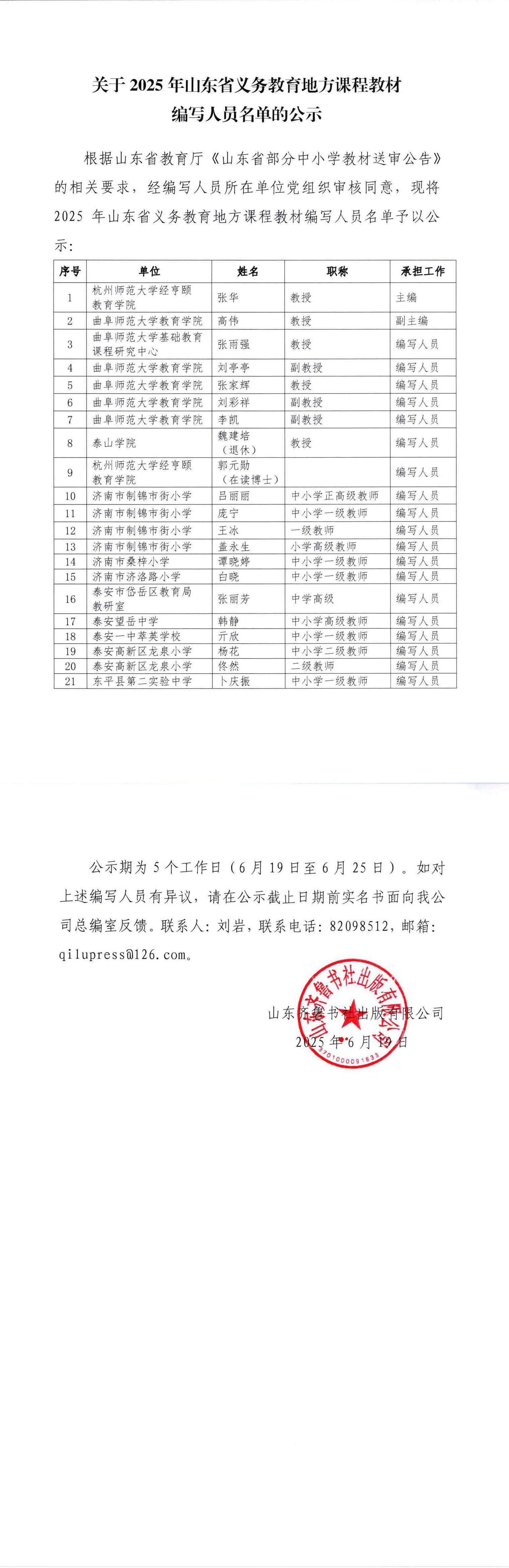 关于2025年山东省义务教育地方课程教材编写人员名单的公示